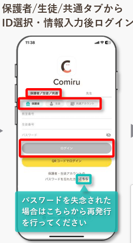 スタッフから届いた「教室番号・生徒番号・仮パスワード」でログインしてください